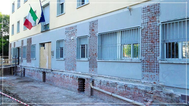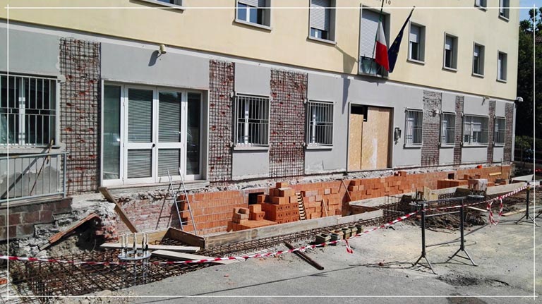 - Lotto 1: interventi di miglioramento sismico, di realizzazione del nuovo porticato, di manutenzione della copertura, di redistribuzione dei locali interni, di protezione della centrale termica sulle porte di sicurezza e di illuminazione della facciata e del porticato